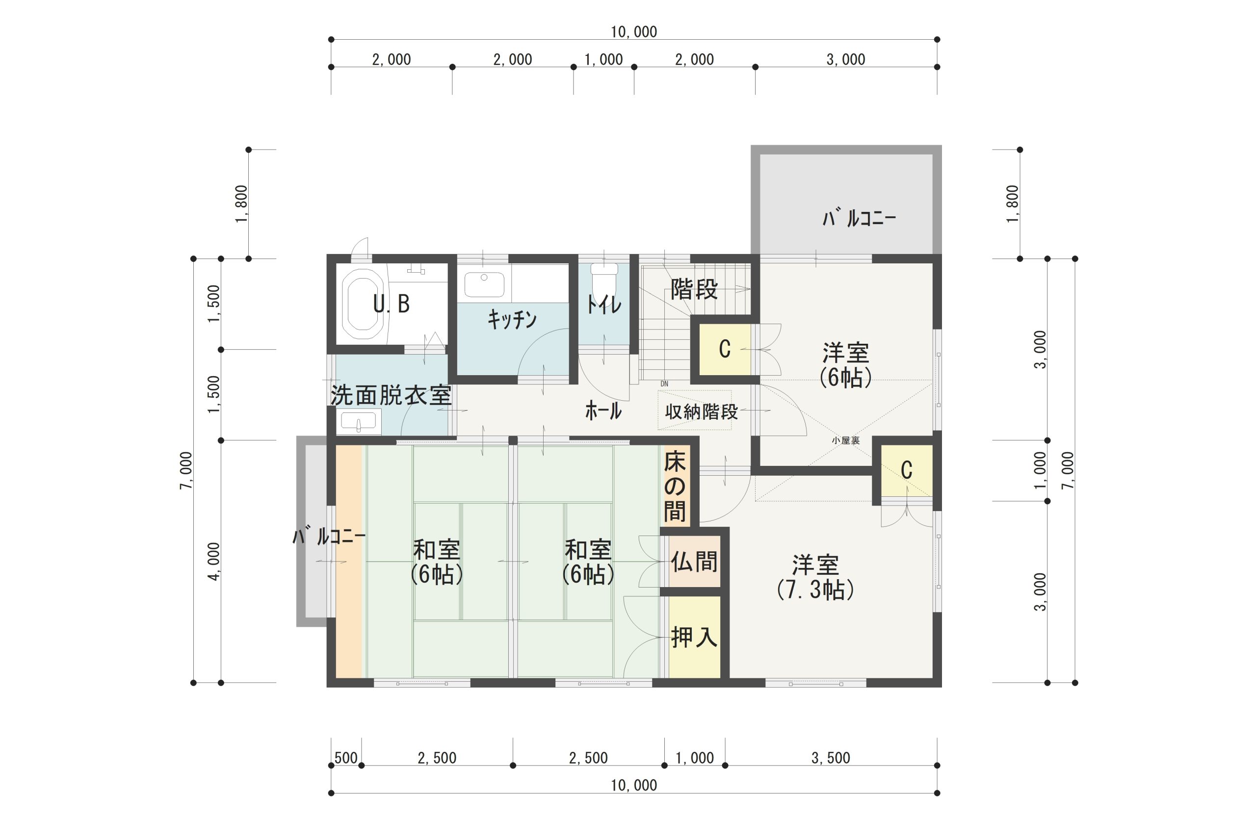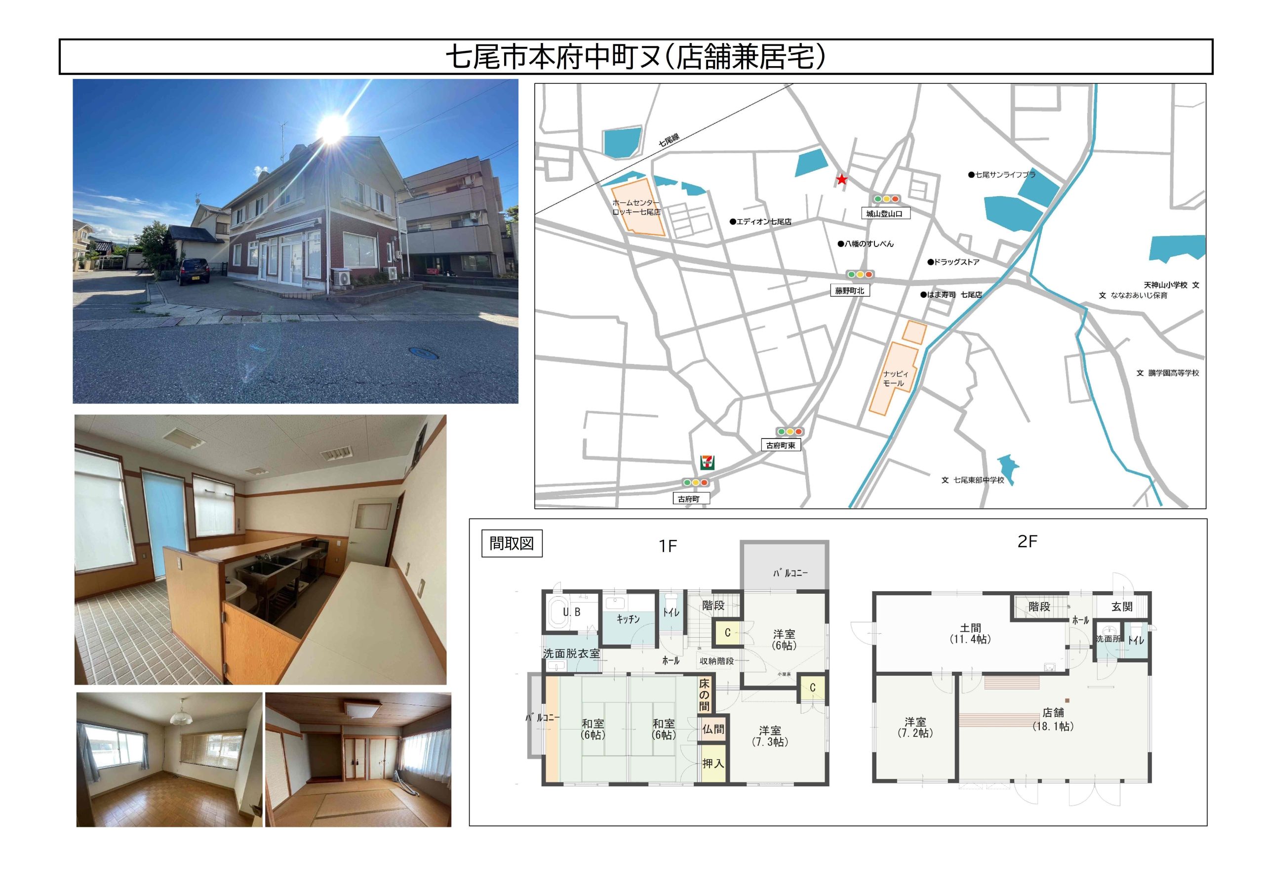 | 部屋数 | 1階 店舗 土間 洋室7.2帖 洗面所 WC 2階 K2帖 洋室6帖・7.3帖 和室6畳・6畳 UB WC 洗面脱衣室 小屋裏収納 | |||